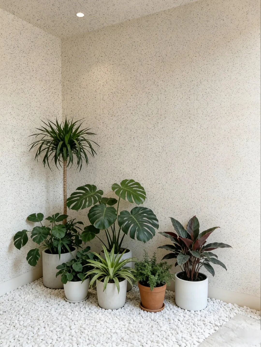 浅蓝色玛拉彩石搭配白色铁艺桌椅与绿植,打造地中海风阳台,清晨在这里喝咖啡、读好书,仿佛置身海边度假;灰色款则适配现代简约风,让阳台成为晾晒、养花的实用休闲区。